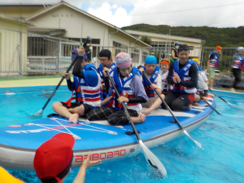 6月下旬から水泳が始まりました。生徒たちとルールを毎回確認し、安全に活動ができるようにしています。生徒たちは浮き具やビート板を使ってバタ足の練習をしたり、プールに浮かべたボールを集めたりして、とても楽しんで活動しています。今後も安全に留意して、水泳を行っていきます。