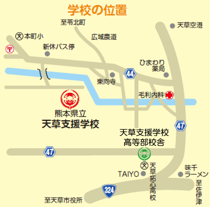 熊本県立天草支援学校 《小・中学部校舎》 〒863-0005 熊本県天草市本町新休972番地 TEL:0969-23-0141 FAX:0969-22-5673 《高等部校舎(天草拓心高校内)》 〒863ー0002 熊本県天草市本渡町本戸馬場495番地 TEL:0969-24-3434 FAX:0969-24-3436