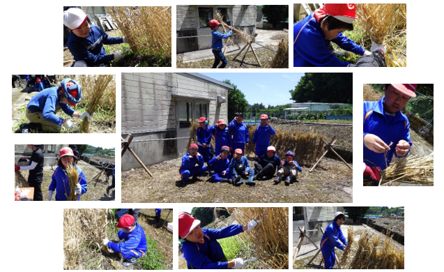 6月6日(木)に、小学部5・6年生が育てた小麦の収穫を行いました。例年より1ヶ月程生育が遅れ、「収穫できるかな?」と心配していた子供たちでしたが、無事に小麦が実り、収穫することができました。「鎌で麦を刈って収穫する」、「紐で麦を束ねる」、「束ねた麦を干し竿に掛ける」という役割をみんなで交代しながら、協力して収穫することができました。