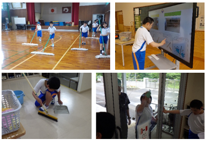 2・3日目は、2グループに分かれて掃除をしました。体育館の床のモップ掛けをしたり、スクイジーを使って窓をきれいにしたりして、それぞれの場所の掃除をすることができました。振り返りでは、「窓をスクイジーできれいにしました。」「モップを頑張りました。」と発表していました。