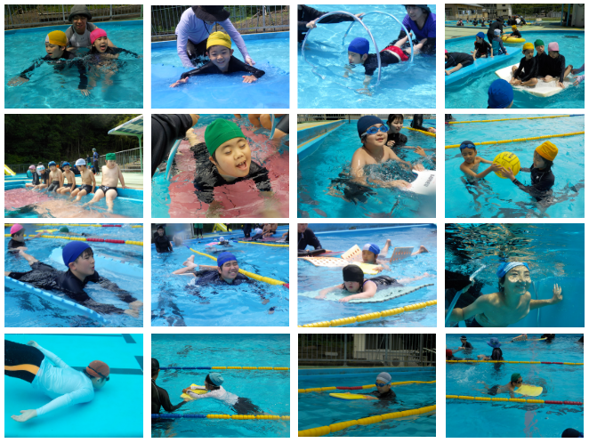 泳ぎの練習をするグループでは、プールの床から足が離れると不安そうな表情をしていましたが、ビート板やマットを使って水に浮くという感覚に慣れていくことができました。