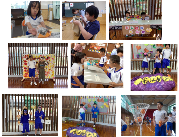 5つのグループを設定し、「トンボのめがね」「スチロールトンボ」「かき・くりだいしゅうかく」「いもほりほり」「おめんやさん」といった季節も感じられるようなネーミングにしました。単元期間はお祭り当日に向けて必要な物を制作したり、お店の練習をしたりと、学年を超えて協力しながら活動することができました。その中で、名前を呼び合ったり、道具を一緒に運んだりと少しずつ友達を意識する場面も見られました。