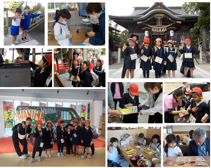 11月21日(木)に、「本渡諏訪神社」と「中央銀天街」、「ジョイフル」へ校外学習に出掛けました。今回は、天草支援学校のある本渡の街を探検すること、「おでかけ」の約束を守って友達と一緒に行動することを目的に出掛けました。