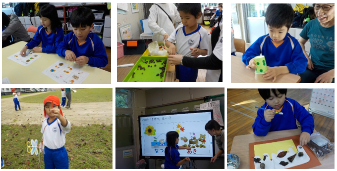 前半は、秋ビンゴや楽器、おもちゃ作りを通して、秋の食べ物や植物、生き物を知りました。後半は、前半で学習したことを生かして実際に運動場で秋探し!落ち葉やどんぐりを見付け、自分で集めた材料でケーキの作品をつくりました。単元の初めは今の季節を聞くと「夏!」「冬!」と答えていた子供達も、だんだんと「今は秋!」「夏の次は秋!」と季節の移り変わりに気付く姿が見られました。最近、急に寒くなってきましたが、これからも季節を肌で体感しながら理解を深めていってほしいと思います。
