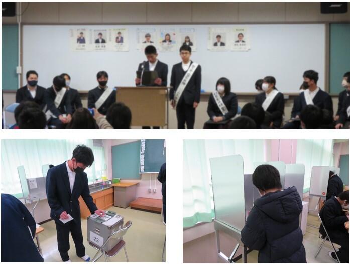 1月30日(火)に生徒会役員選挙立会演説会及び投票を行いました。立会演説会では、各候補者や応援者が壇上に立ち、公約など熱い思いを投票者に訴えかけました。本校では、よりリアルな選挙場面を生徒に体験してもらうため、天草市役所から投票箱や投票記載台をお借りし、選挙を行っています。