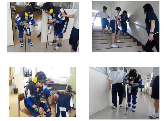家庭科の授業で、高齢者の日常や生活についての学習を行いました。高齢者疑似体験セットを使用し、普段の生活で、どのようなことが大変なのかを体験しました。生徒たちは、体が重い、腰が痛い、視野が狭い、階段が上りづらい等の感想をもち、自分たちにできることとして、重い荷物は代わりに持ってあげたい、話すときは、ゆっくり、大きな声で話したいという意見がありました。