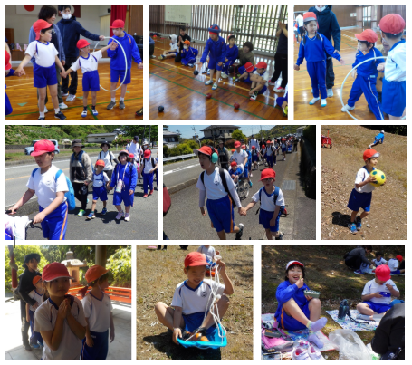 前日が雨だったため、地面が乾くまで、学校で、フラフープくぐりリレーとボッチャを楽しんだ後に、出発しました。鈴木神社に到着すると、お弁当を楽しみにして歩いてきたのか、すぐにリュックからレジャーシートを取り出した子供たちでした。食べ終わると、クラスごとに神社でお参りしたり、友達と草スキーやキャッチボールをしたりして、楽しいひと時を過ごすことができました。