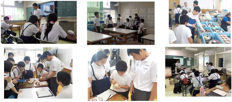 1、2年生は高等部主事に、「高等部生活や現場実習のこと」「高等部卒業後のこと」を話していただき、真剣な表情で聞いていました。特に、現場実習先の説明は、「スーパーセンターTAIYO」「ナフコ」「マクドナルド」など、知っている会社名があり、生徒の中から、「コンビニで働いてみたい」という感想も聞かれました。高等部教室見学では、中学部にない作業班にとても興味津々でした。また、天支球の製作体験もすることができました。