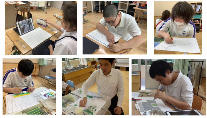 5月の美術の授業では、風景画の制作に取り組みました。構図の取り方を学習した後、構図を考えながら、自分が描きたい場所をiPadのカメラ機能を使って写真撮影をしました。「下からの階段を描きたい!」「このドアを主人公にしたらどうかな?」と、友達や教師と相談する様子が見られました。遠近法や混色についても学び、「私のだいすきな学校」「いつも通るろうか」などのタイトルで、毎日過ごす学校を描くなど、工夫を凝らした風景画を制作することができました。