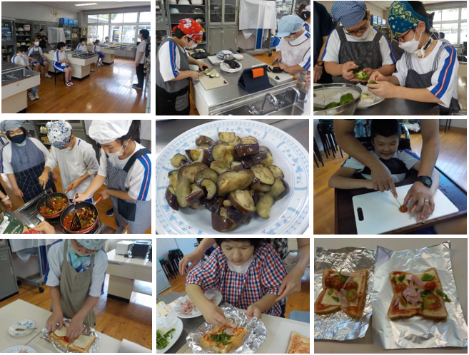 職業・家庭のABグループでは、ピーマンの塩コショウ炒め、ピーマンのマヨネーズ和え、ナスの塩コショウ炒め、ナスのカレー揚げ、夏野菜のラタトゥイユの5種類の料理を、Cグループでは、夏野菜を使ったピザトーストを作りました。事前に手順や注意事項を確認し、安全に調理することができました。