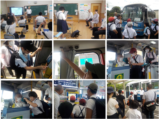 7月5日(金)中学部1年生と中学部重複障がい学級1・2年生の生徒で、「公共交通乗り方教室」を実施しました。これは、天草市と産交バス株式会社の共催で実施している事業で、バスの利用の仕方やマナーについて体験的に学習するというものです。