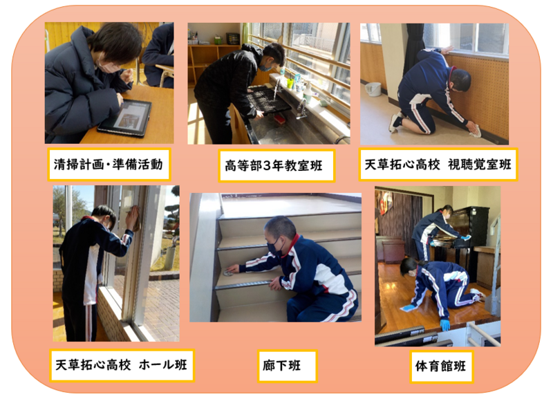 縦割りでグループに分かれ、事前に清掃の手順や役割、使用する道具等を話し合い、取り組みました。清掃当日は、話し合った内容を参考にしながら各グループが主体的に清掃することができました。本校や天草拓心高校への日頃の感謝の気持ちを行動に表す良い取組となりました。