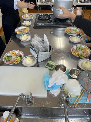 現在、1年生の家庭科の授業では、調理実習で「肉まん」と「リャンバンスー」に挑戦しています。
