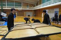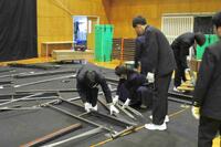 上演終了後には、1,2年生の図書委員及び希望する生徒が舞台の撤収作業の手伝いをするとともに、劇団の方と交流を行いました。当初予定していた以上のたくさんの生徒が撤収の手伝いに参加してくれて、あっという間に撤収作業が終了し、いつもの体育館に元通りになりました。予定していた撤収終了時間の1時間前には完了し、これまでの最短記録の撤収時間だったそうです。