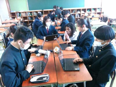 英語コミュニケーションⅡでは、今月、「学校紹介ビデオ制作」のプロジェクトを行っています。くじ引きで決定した各クラスのテーマに沿った学校紹介動画を英語で作り、海外の方に見ていただこうと頑張っているところです。