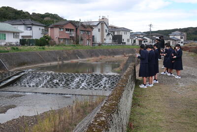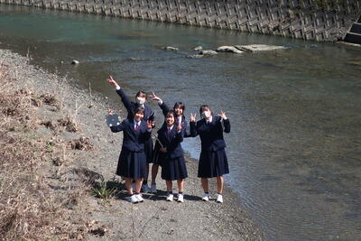 ミニ課題研究は物理・化学・生物・地学の4分野全てで行われており、学校周辺を流れる町山口川を共通の題材としています。