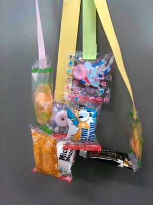 At the beginning of English classes today, we had a little award ceremony.  This is to acknowledge those who were chosen to be representatives for the promotion video making project in each class.  William-sensei gave each winner a “medal” (made with some sweets as you can see). Every winner looked a little shy but proud of the award. Some students even kept wearing their medals during the class!