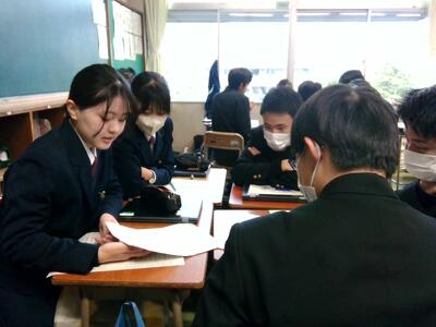 授業前の休み時間にはやや緊張していた生徒もいましたが、始まってみるとアットホームな雰囲気で発表が進み、笑顔もよく見られました。発表者はジェスチャーなども交えながら分かりやすく説明する工夫をしており、質疑応答の時間には活発に質問も出ていました。3年間の探究活動で培ってきたプレゼンテーション力が、ここでも活かせていますね!