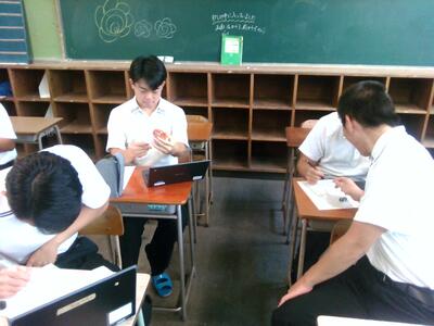 Today in English Communication II, we watched the finished promotion videos in class. Although all the videos in the class were created on the same theme, each came out very unique. Listening to other groups, students learned things like good use of charts and diagrams, or creative use of subtitles. We teachers were also surprised at how stylish and cool the videos were. The young are talented in using digital devices indeed!