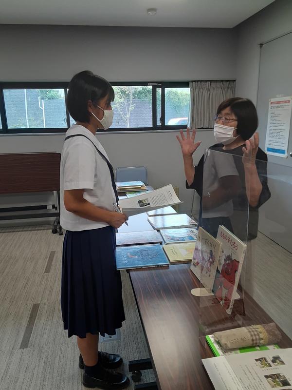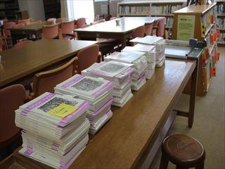 さっそく資料を探しに来館する3年生。特設コーナーは、早くも品切れが目立っています。
