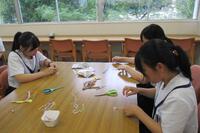 ↓しおりに付けるミサンガを図書委員が作っている様子の写真です。
