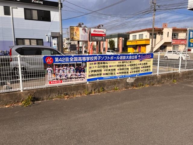 男子ソフトボール部保護者会とOB会より、全国出場を祝う横断幕を作成していただき、