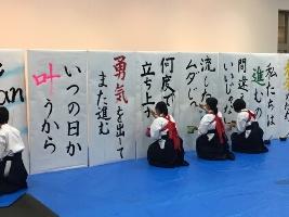 天草高校書道部のパフォーマンスは、大きなキャンバスに書を書き、作品が来場者に見えるように工夫されています。