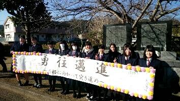 受験生の背中を後押しする横断幕や、2年生全員の見送りを受け、受験会場である熊本大学に向けて出発しました。