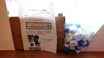 10月16日の生徒朝礼で広報されたペットボトルキャップを集めるボランティアの途中経過です。