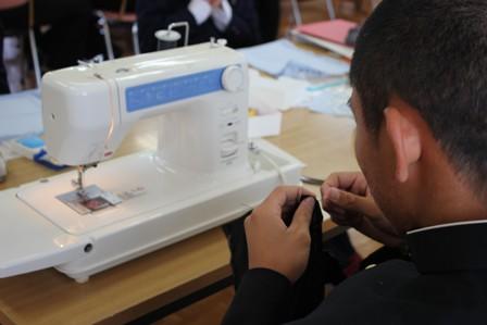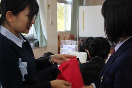1年家庭科では初めてミシンを使い、巾着袋を製作しています。