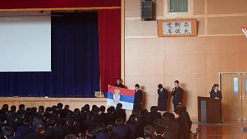 平田校長から激励を受け、宮崎先生と辻学年主任からの話がありました。