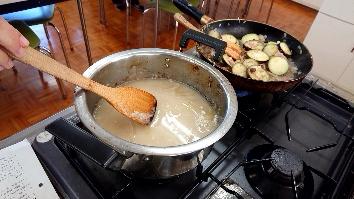 なすのトマトソースパスタを、役割分担しながら調理しました。