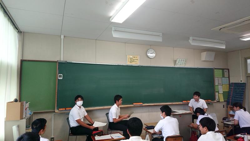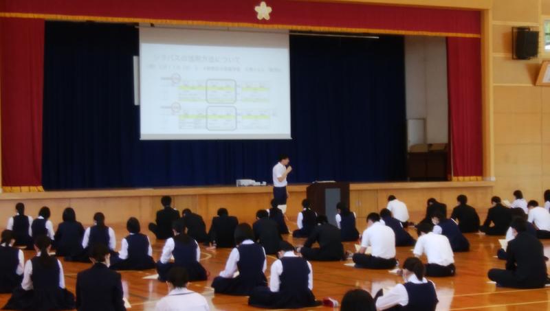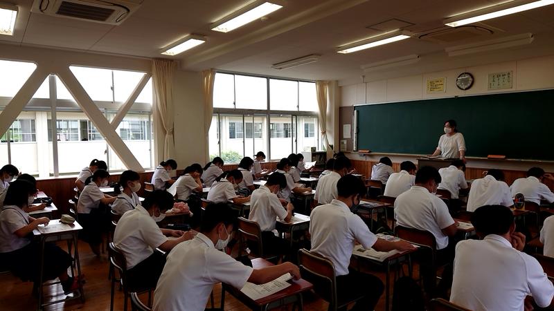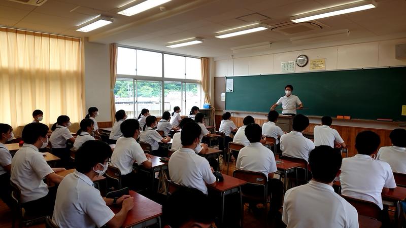 はじめに学年主任の岡村先生から、期末考査が終わっても解放感にひたることなく、また、服装や挨拶、スマートフォンの使い方などの生活面での指導を受けることもなく、受験勉強に全力で臨むようにとの話がありました。豪雨災害などの影響で当たり前の学校生活が送れない高校生もいる中で、今普通に学習ができていることや、部活動の大会に参加できることに感謝の気持ちを持ち、当たり前の基準を上げて生活しようという激励の言葉に、思いを新たにした生徒が多かったようです。