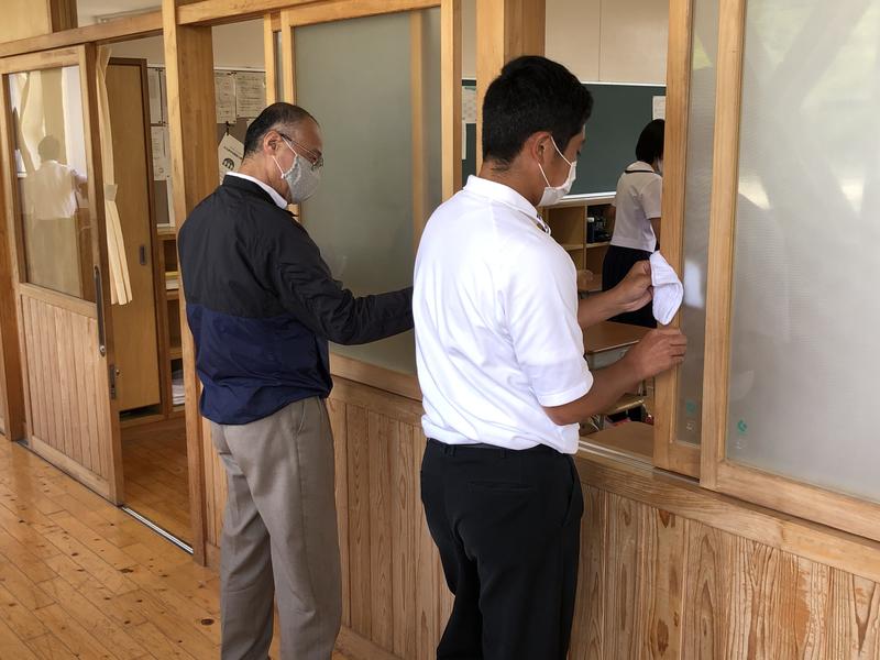 生徒はしっかり手を洗って、職員でその間にドアノブ等の消毒を行います。