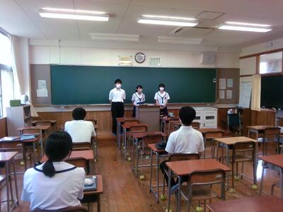 全日制・定時制それぞれの報告の後、全日制保健委員会の生徒4名が保健委員会の活動について発表を行いました。保健委員長の山口さんを中心に、健康観察の意識付けのために行っている「朝の放送」や「天草地区保健委員交流会」についての報告がありました。これは、地域の高校の保健委員が情報共有をはかるために年2回リモートで開いている会議で、今年度からの新たな取組です。他校の活動を参考にしたり、共同でAEDの使い方についてのポスター作成を目指したりと、今後も交流を深めていきたいということでした。