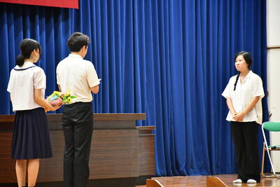 サラ先生は日本語と英語を交えたスピーチで、この2年間でのかけがえのない思い出や、天草高校の生徒たちがどんなに素晴らしいか、また、天草高校のスタッフへの感謝などをひとつひとつ、丁寧に述べられました。スピーチの後、3年生の岡部くんが生徒代表として英語でお礼のスピーチを述べ、同じく3年生の今福さんが花束を贈呈しました。