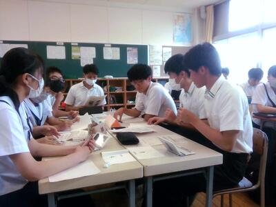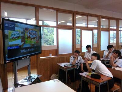 Today in English Communication II, we watched the finished promotion videos in class. Although all the videos in the class were created on the same theme, each came out very unique. Listening to other groups, students learned things like good use of charts and diagrams, or creative use of subtitles. We teachers were also surprised at how stylish and cool the videos were. The young are talented in using digital devices indeed!