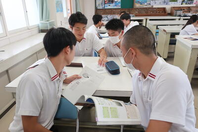 In English Communication II class, students are working on the "School Promotion Video” project this month. They have been working hard to make a school introduction video in English for people overseas to watch. Each class is working on a different part of the video, and the themes of each group are as follows: