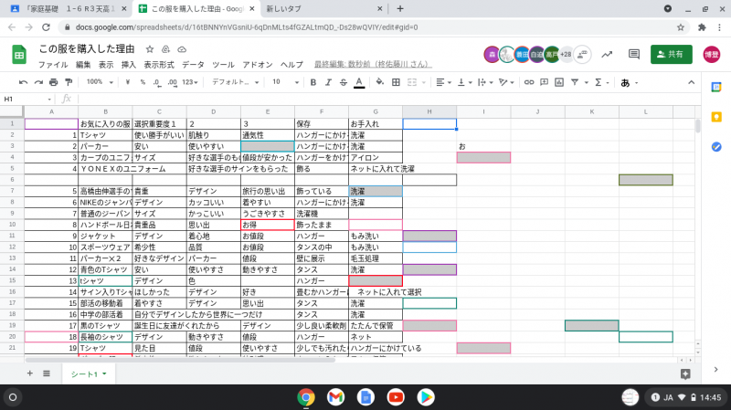 クラス全員が「服を選んだ理由」を一つのスプレッドシートに入力しています。