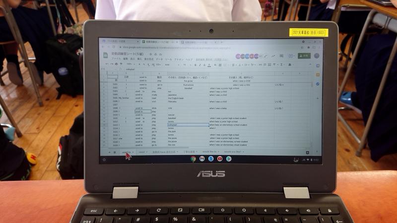 教科書の確認から、英作文作成といった流れですが、スプレッドシートに書き込むため、全員の意見が共有できます。