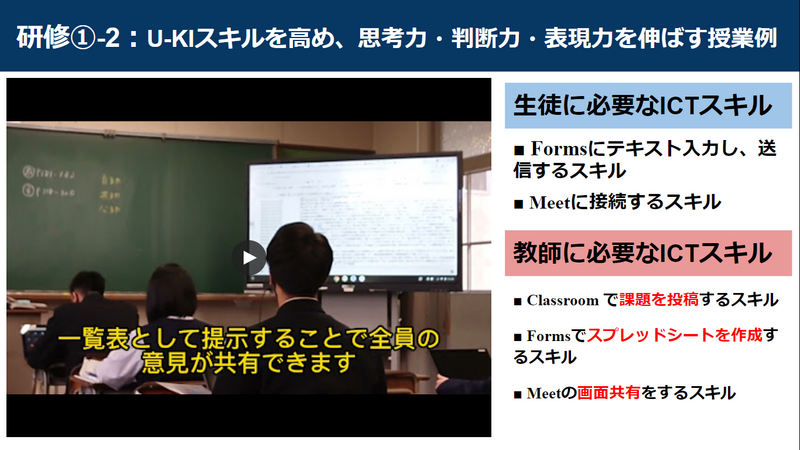 「生徒の立場で Classroom を活用してみる」「教師の立場で Classroom を活用してみる」といった2つの研修内容です。