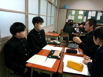 授業前の休み時間にはやや緊張していた生徒もいましたが、始まってみるとアットホームな雰囲気で発表が進み、笑顔もよく見られました。発表者はジェスチャーなども交えながら分かりやすく説明する工夫をしており、質疑応答の時間には活発に質問も出ていました。3年間の探究活動で培ってきたプレゼンテーション力が、ここでも活かせていますね!