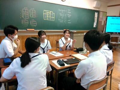 William先生が用意した本日のトピックは「住むなら都会より田舎がいい」。都会に憧れる天高生、都会派はやはり強いです。「交通網が発達していて便利」「買い物での選択肢が多くある」などのもっともな意見から、「有名人に会える」「イケメンが多い」という願望混じり(?)の意見まで次々と出てきます。でも、「いい人の割合が多い」田舎派も負けじと応戦します。「田舎は虫が多い(から良くない)」という都会派のattack(反論)に、「普段から虫と接していると、耐性がついて強くなる」と主張する田舎派。「都会は遊ぶところがたくさんある」という都会派に、「田舎は遊ぶところが少ないからこそ、勉強に集中できる」と反論する田舎派。相手の意見に全面的に賛同してしまったり、論理的なスピーチに思わず拍手が起きたり。メモを見ながら協力して反論を考えたり、普段おとなしい生徒が自信たっぷりに相手の目を見て主張していたりと、各班ドラマがあり、本番さながらの白熱したディベートでした。
