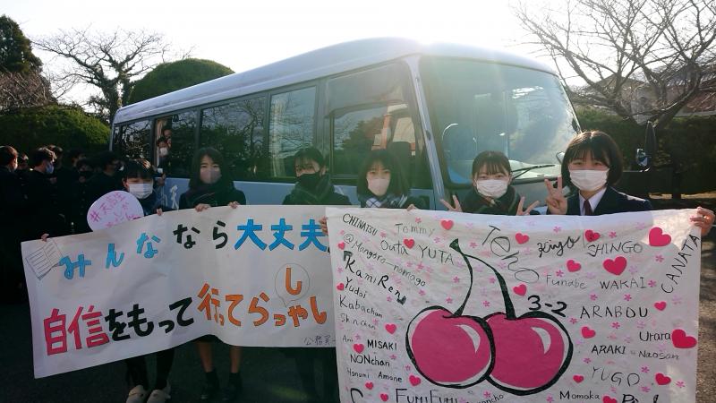1月15日(金)、大学入学共通テストの会場の下見に行く途中、上天草市のショッピングセンター付近の沿道で保護者の方々から応援して頂きました。