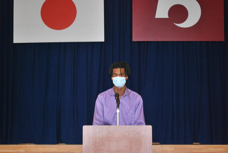 生徒朝礼では、杉尾生徒会長から2学期に向けて全校生徒対する感染予防等のお願いと学校行事に対する意気込みが語られました。