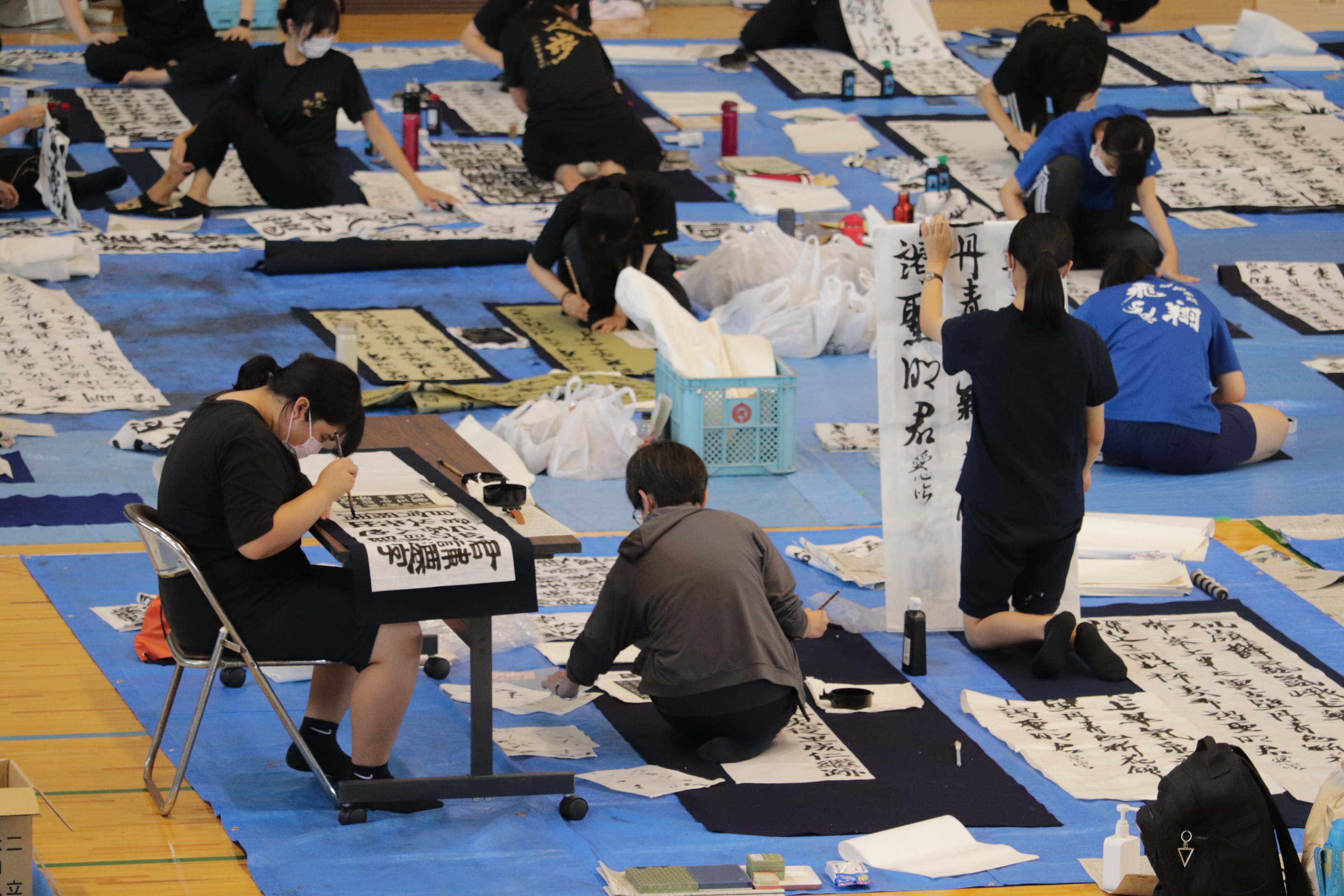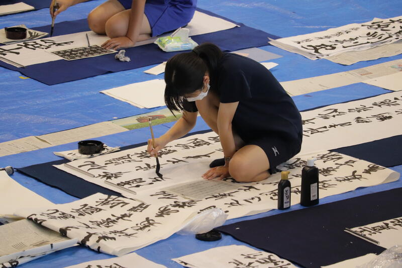 揮毫大会では、県下全域から250人あまりの書道部員が集まり、制限時間2時間の間に課題作品を仕上げます。「はじめ」の合図で出場者は一斉に筆をとって半紙に向かい、会場は一気に緊張感に包まれました。