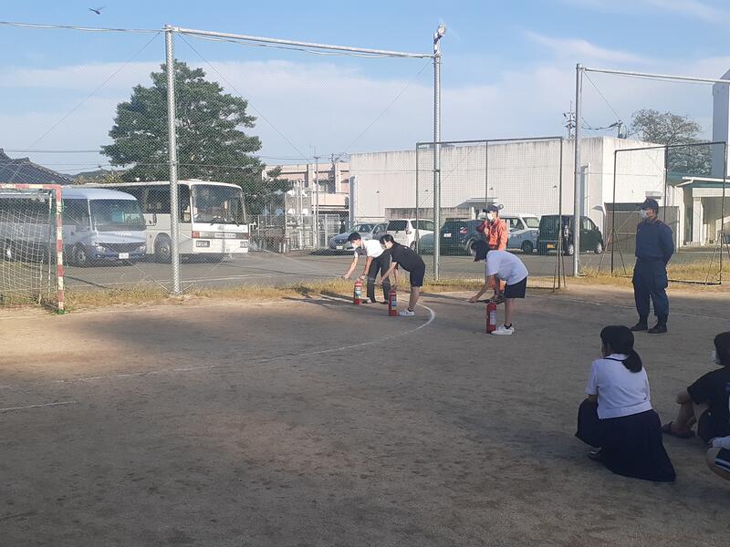 講評の後は、消化器の使い方や、有効射程、噴射時間等の説明が行われ、初期消火や避難時の注意点を学ぶことができました。