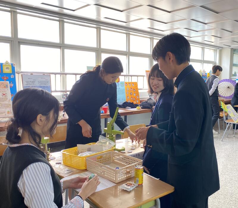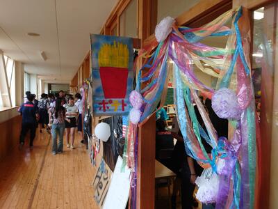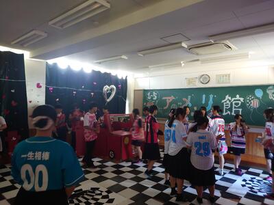 展示企画では校舎全体を使ったクイズラリーやアメリカをイメージした館、トイストーリー風のフォトスポット、ポケモンのオブジェ、夏の屋台、図書委員会による脱出ゲーム、書道選択者による書道展、家庭科授業作品展示、芸術部(美術)と美術選択者による作品展示、芸術部(写真)による写真展、科学部による科学実験講座など多岐にわたる展示がありました。作品をじっくり見学したり、展示作品と一緒に写真を撮る姿が見られ、展示部門も大いににぎわいました。
