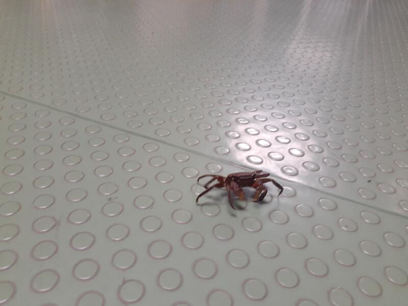 夜の校舎内で、今年初めてのカニが発見されました。