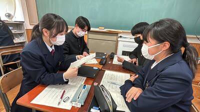 交通安全については、「①登下校時の交通ルール」「②自転車乗車時のヘルメット着用」「③ながらスマホ」の3つのテーマで学習しました。身近にある危険な場面をいくつか想定して考えることで、生徒たちは交通知識を身に着けることができたようです。